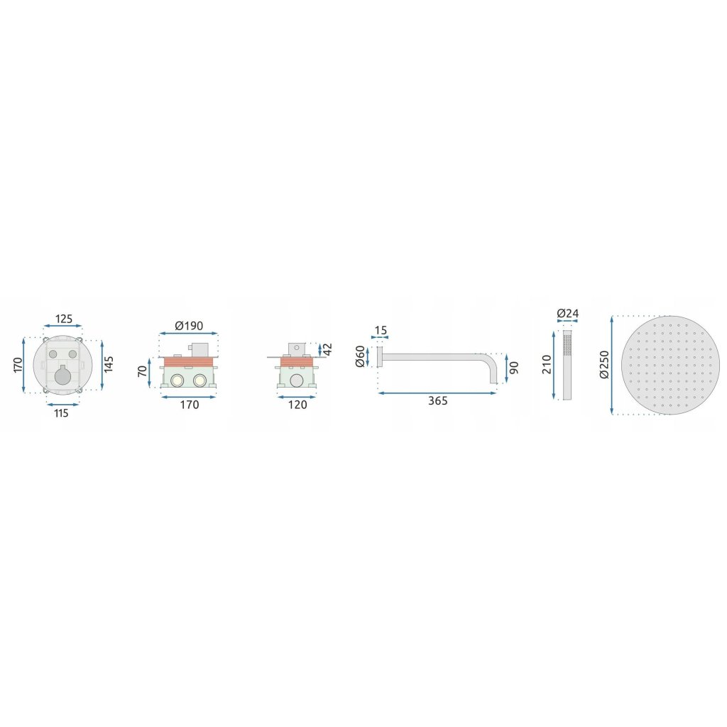 - Set: Duș tip ploaie + braț încastrat + baterie termostatică + cap de duș + furtun de duș