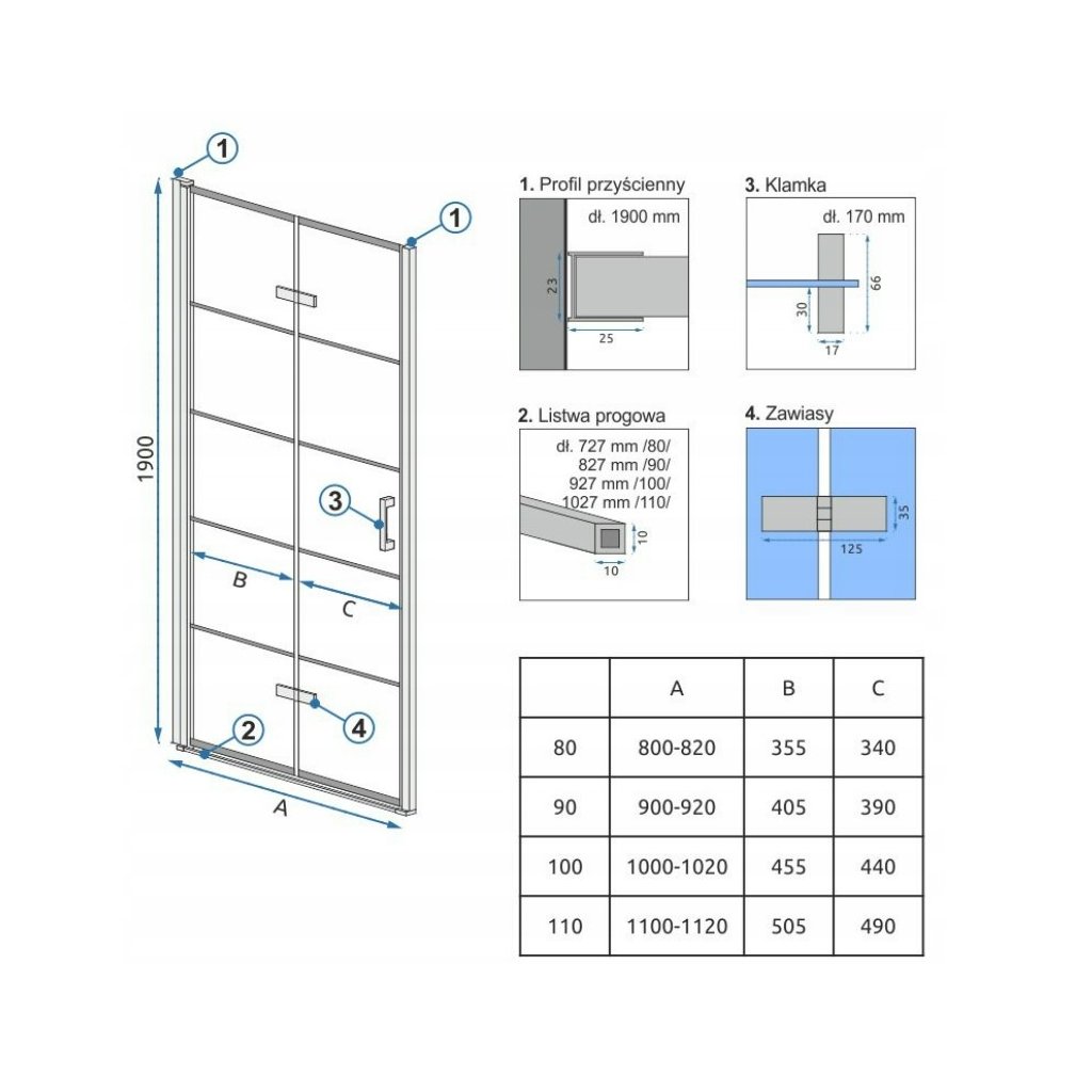Model de ușă de duș din sticlă securizată Crystal Clear de înaltă calitate, cu suprafață Easy Clean aplicată cu laser. Învelișul ușii a fost aplicat pe ambele părți, astfel încât ușa poate fi instalată pe dreapta și pe stânga. Profilul îl definiți singur înainte de instalare. La proiectarea acestui model am folosit forme și forme simple și am creat o ușă cu o intrare confortabilă și largă la duș. Construcția unică fără toc și capacitatea de a plia ușa pe perete înseamnă că ușile Moliere economisesc spațiu și sunt soluția ideală pentru orice baie. Datorită soluțiilor extrem de bine gândite, etanșările utilizate în ușă asigură 100% etanșeitate și fiabilitate în timpul utilizării. Modelul Molier este ideal nu doar pentru băile moderne bazate pe minimalism, ci și pentru interioare clasice și de bun gust. Vopseaua neagră se aplică în procesul de producție și apoi se întărește de două ori împreună cu foaia la 600-800 ° C. Aceasta garantează durabilitate 100% și rezistență la zgârieturi și deteriorări mecanice. Aceasta este singura metodă care asigură cea mai înaltă calitate și durabilitate. Ușa este adaptată pentru instalare pe podea cu scurgere liniară și pe cadă de duș.