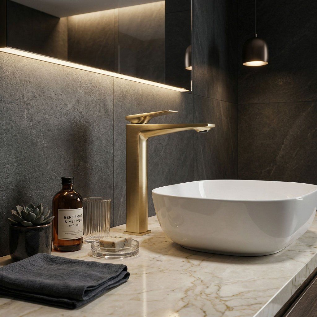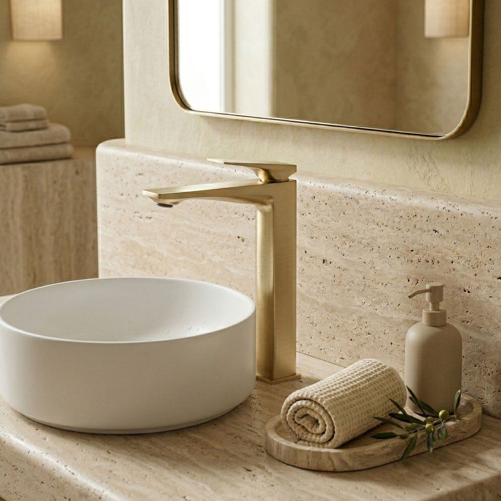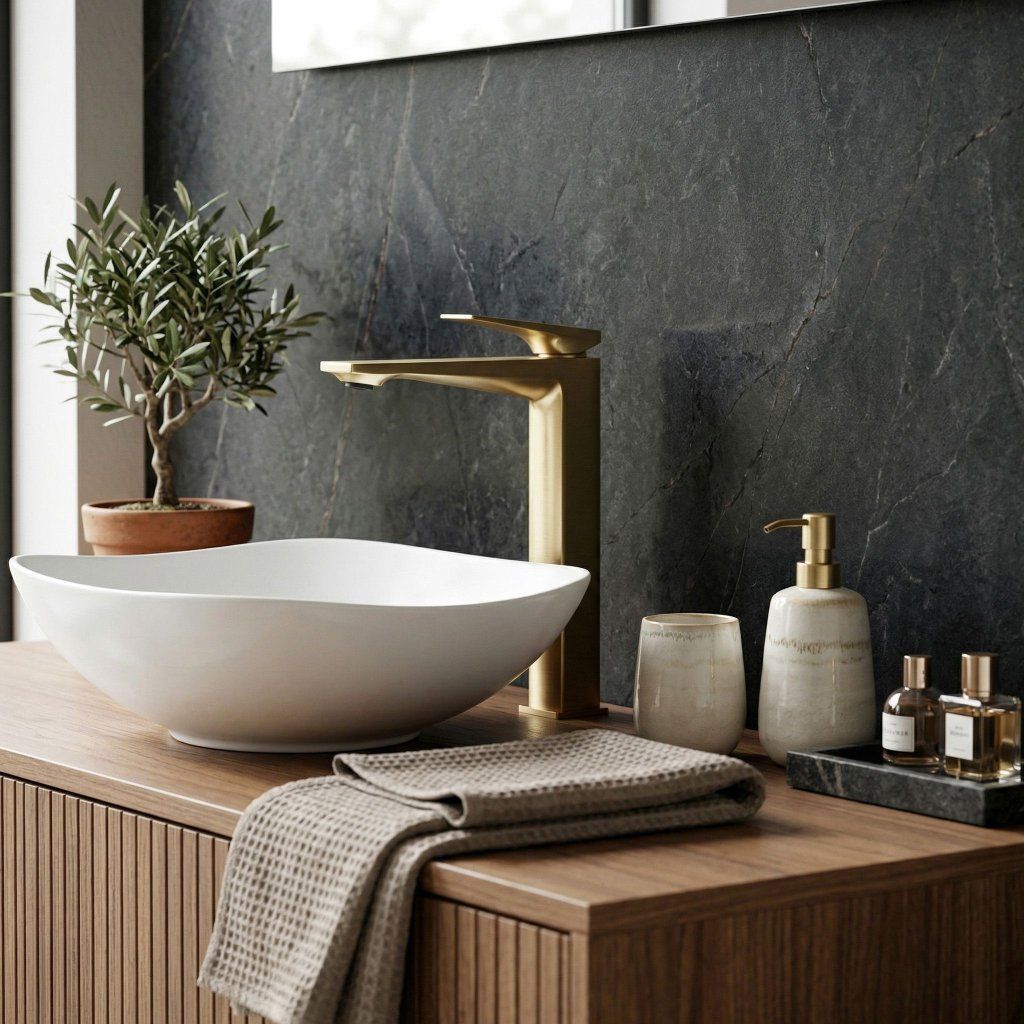 Aurul periat este cel mai versatil dintre toate finisajele aurii — nuanța satinată, fără efect de oglindă, se potrivește natural cu ceramica bej și ecru, chiuvetele din piatră artificială cu model de piatră, elementele din lemn natural și plăcile luxoase închise la culoare. Nuanța caldă a auriului se potrivește cu orice material care are o notă caldă.
