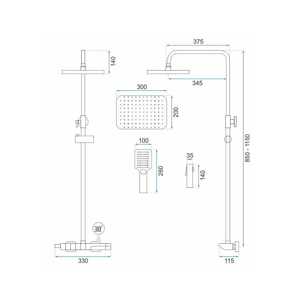 - Duș cu ploaie: 300 x 200 mm