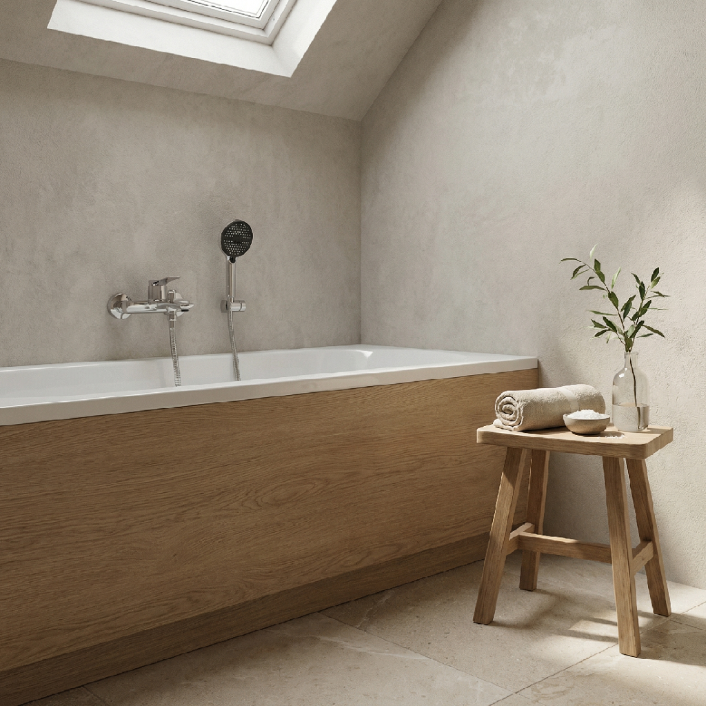 Bateria Vision se potrivește perfect băilor dominate de linii curate, culori neutre și materiale de calitate. Combinată cu o cadă independentă, placare din beton sau plăci ceramice de format mare, creează o impresie elegantă, asemănătoare unui hotel, acasă.