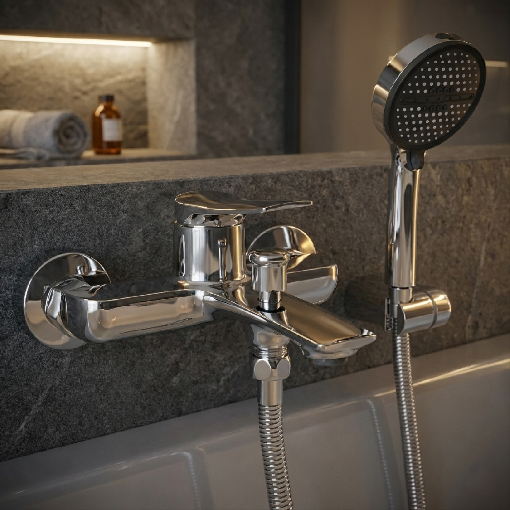 Dușul manual de pe suportul de lângă baterie este mereu la îndemână — o soluție practică atât pentru dușul zilnic deasupra căzii, cât și pentru îngrijirea copiilor sau a animalelor de companie.