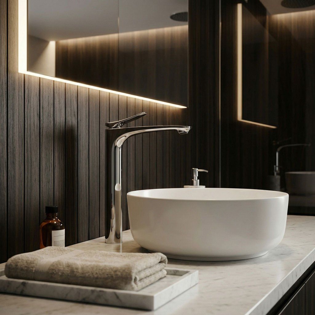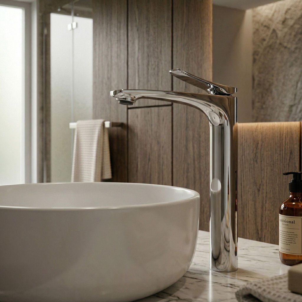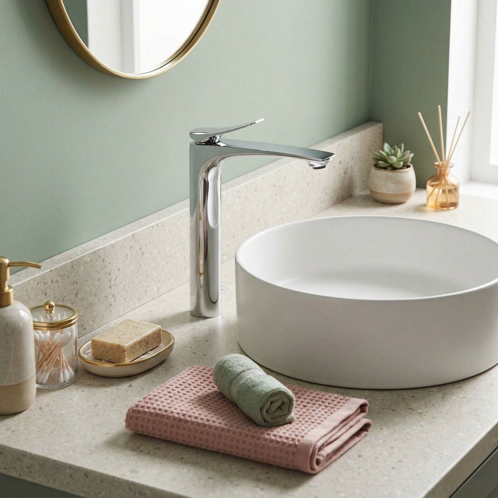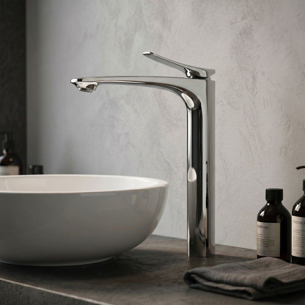 Silueta înaltă și subțire completează vizual și forma verticală a lavoarului de blat — bateria și vasul formează împreună un întreg armonios, orientat vertical, care arată aerisit și atent, indiferent de stilul băii.