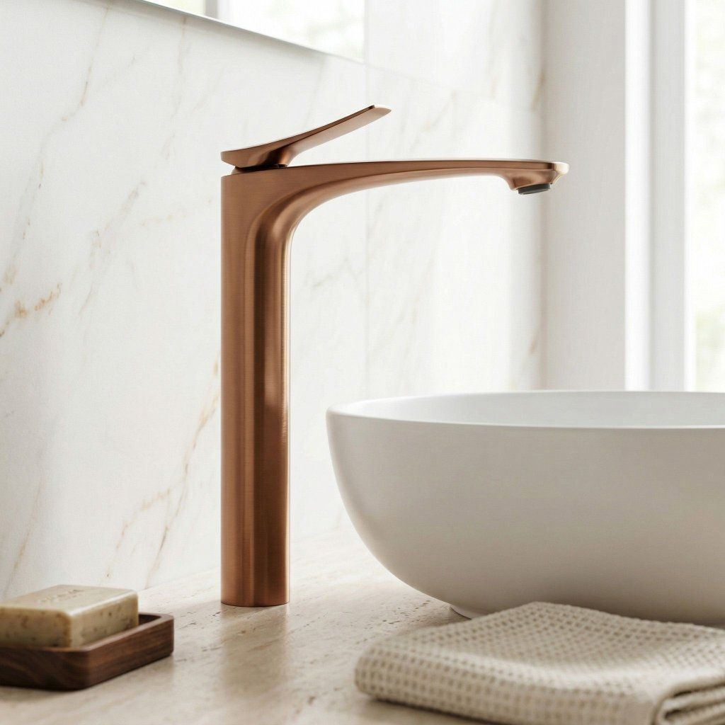 Nuanța cuprului este un material natural din punct de vedere al culorii — se armonizează cu chiuvetele bej și ecru din piatră artificială (Marlo, Saturn, Kallisto, Azalia), cu lemnul natural și cu plăcile de teracotă și pământii. În aceste combinații, cuprul nu apare ca metal, ci ca un accent natural organic.