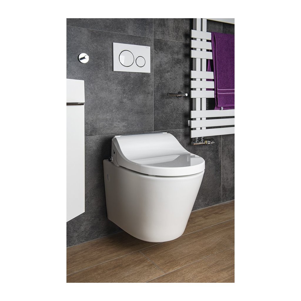 | Scaun incalzit cu reglabil temperatură | Incalzire apa cu temperatura reglabila | Funcție automată - cu un singur buton începeți clătirea și uscarea ulterioară | Scaun rabatabil soft close pt manipulare sigură |