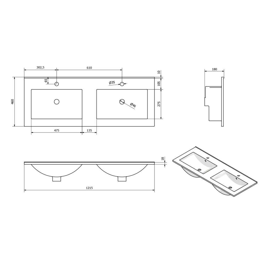 Sapho, chiuveta dubla ceramica SLIM 120x46cm, mobila, 1601-120