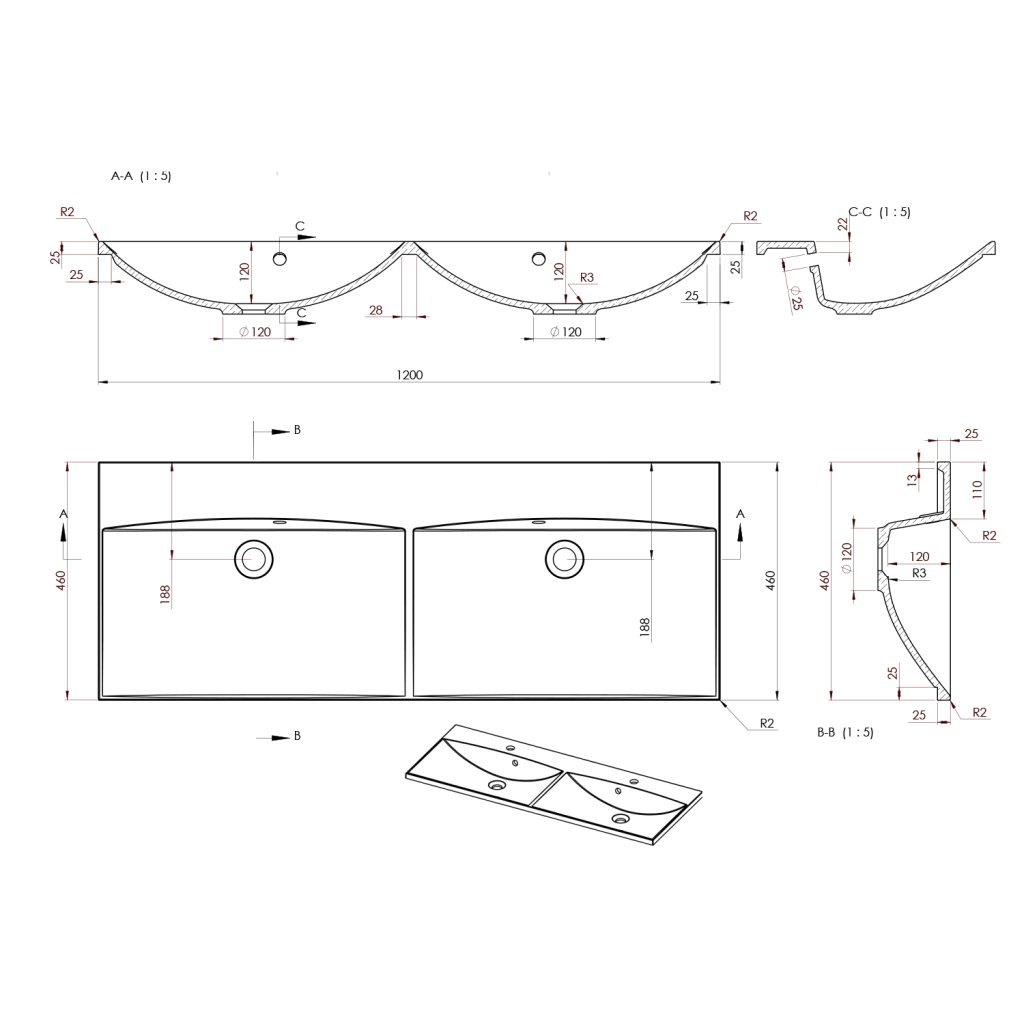 Sapho, chiuvetă dublă MARIA 120x46cm, marmură turnată fără orificiu pentru robinet, alb, MA120-0