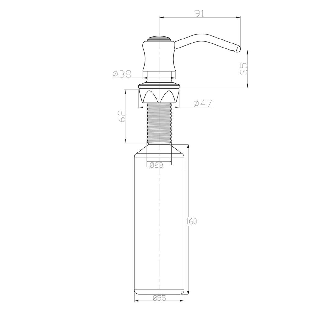 Dozator încastrat pentru săpun și detergent cu posibilitate de instalare într-o chiuvetă în loc de baterie, sau într-un blat de lângă chiuvetă sau chiuvetă.