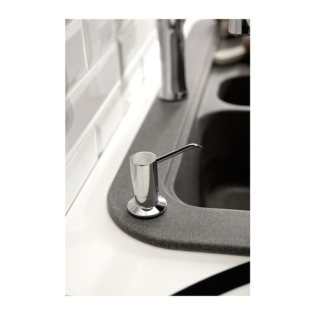 Dozator încastrat de săpun și detergent cu posibilitate de instalare într-o chiuvetă în loc de baterie cu stand, sau într-un blat de lângă chiuvetă sau chiuvetă.