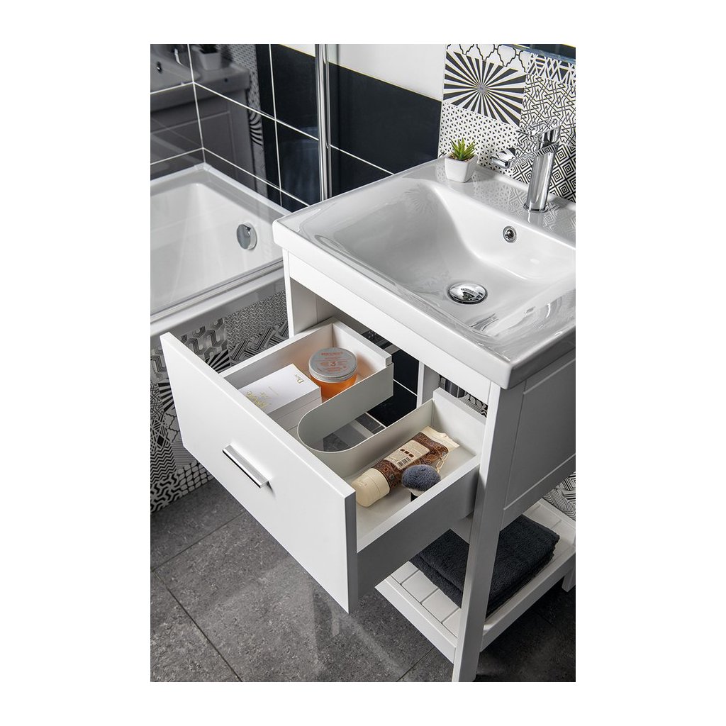Seria ETIDE de mobilier practic cu rafturi oferă o soluție de spațiu de depozitare aerisit și simplă sub popularele chiuvete ZUNO și SAVA. Mobilierul este realizat din MDF de înaltă calitate vopsit într-o nuanță modernă de alb mat. Are efect de lumină și va aduce utilitate și frumusețe băilor de diverse stiluri.