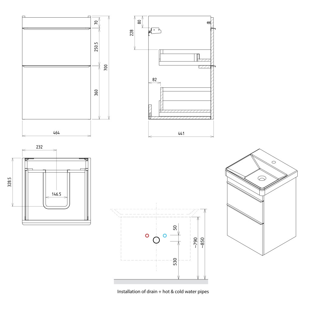 Mobilierul se livreaza asamblat, gata de montare imediata. Instalați mobilierul pe un perete plat. Dacă corpul dulapului este răsucit, funcția mecanismelor de închidere poate funcționa defectuos. Nu expuneți mobila la umezeală permanentă și la contactul cu apa. Aerisiți corect baia după utilizare. Utilizați etanșant siliconic împotriva posibilelor scurgeri în dulap.
