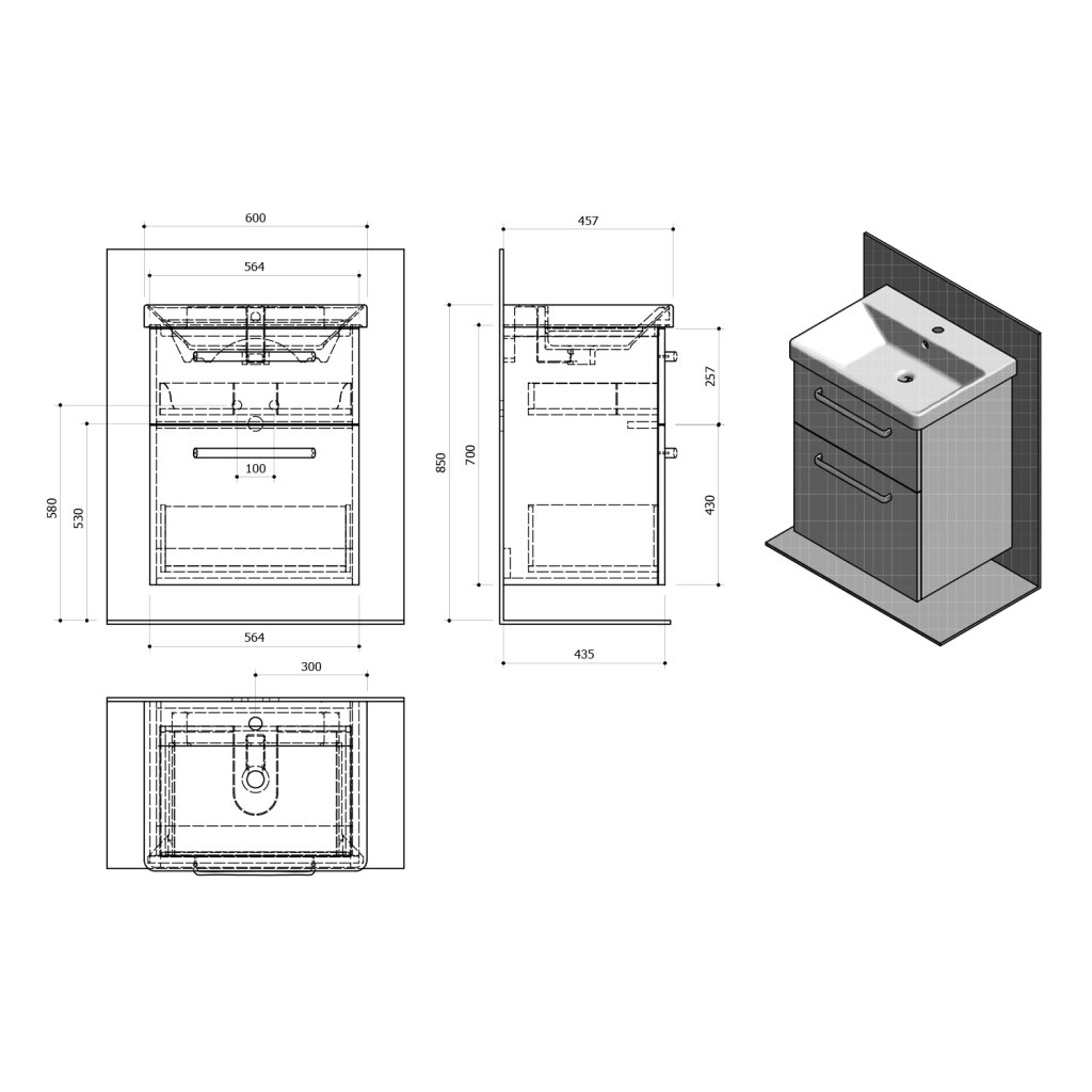 Sapho, dulap pentru lavoar THEIA 56,4x70x44,2cm, 2x sertare, alb (TH060), TH060-3030