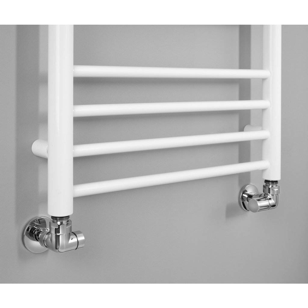Robinetele de conectare pe care le oferim sunt livrate cu un racord de compresie pentru cele mai comune țevi (Cu Ø15 mm și Alupex Ø16 mm), deci nu este nevoie să achiziționați nimic suplimentar pentru conectare. Recomandăm achiziționarea de rozete de acoperire pentru a acoperi țevile de alimentare și găurile din perete.
