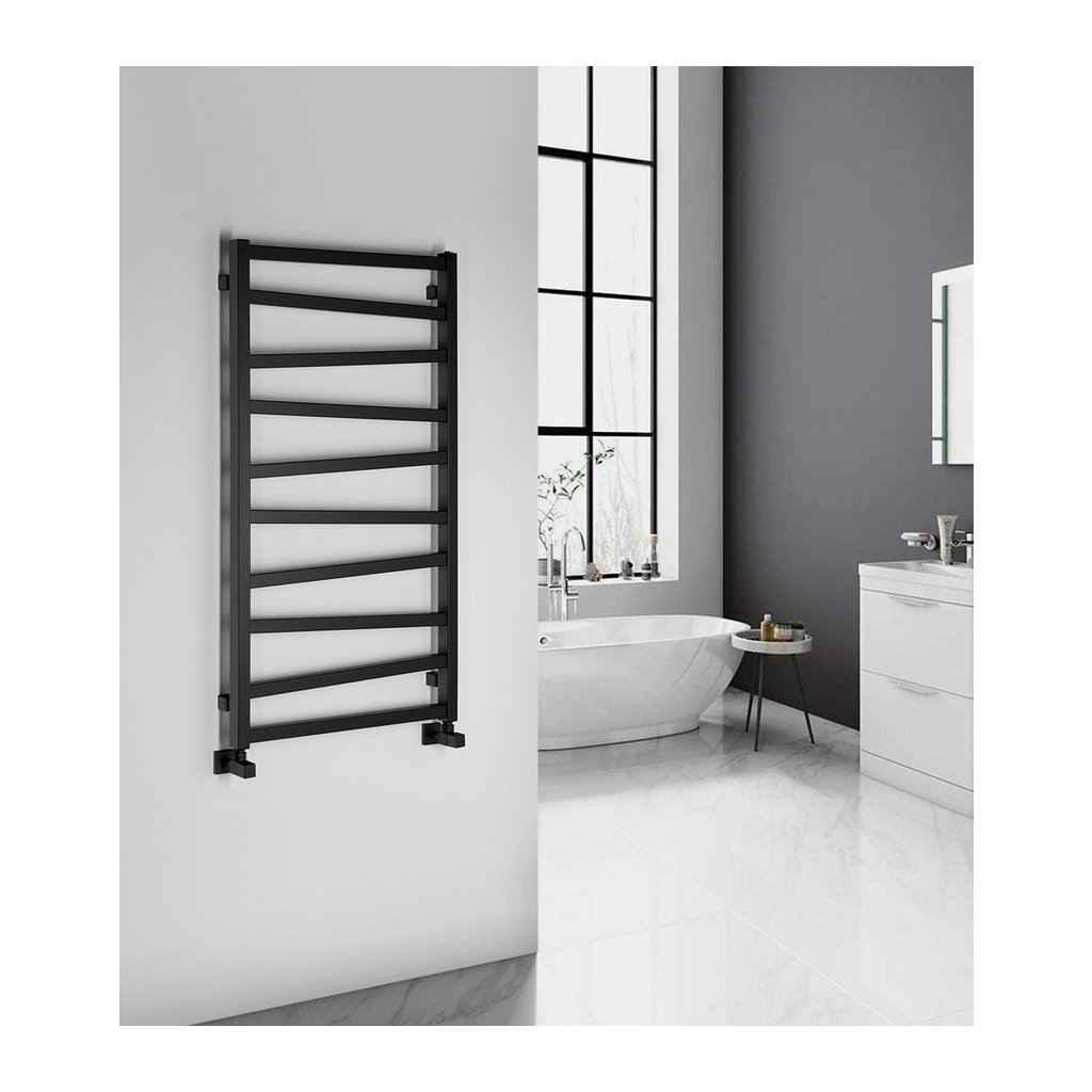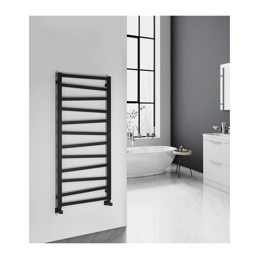 Elementul de încălzire cu diferite țevi centrale subliniază designul băii. Posibila combinatie de incalzire centrala si electrica. Disponibil în alb, antracit structural și negru mat.