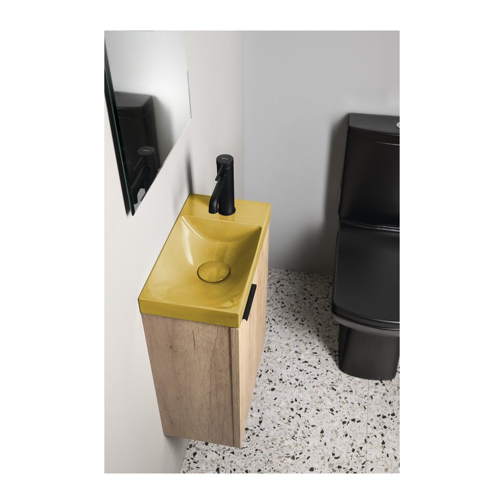 Lavoarul din beton SAPHO AGOS, cu finisaj galben lucios, aduce prospețime și o expresie modernă băii. Dimensiunile compacte de 40 × 22 cm îl fac o alegere ideală pentru băi, toalete sau camere de oaspeți mai mici. Varianta stânga/dreapta vă permite să ajustați amplasarea în funcție de designul interior.