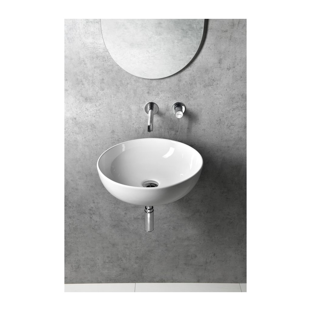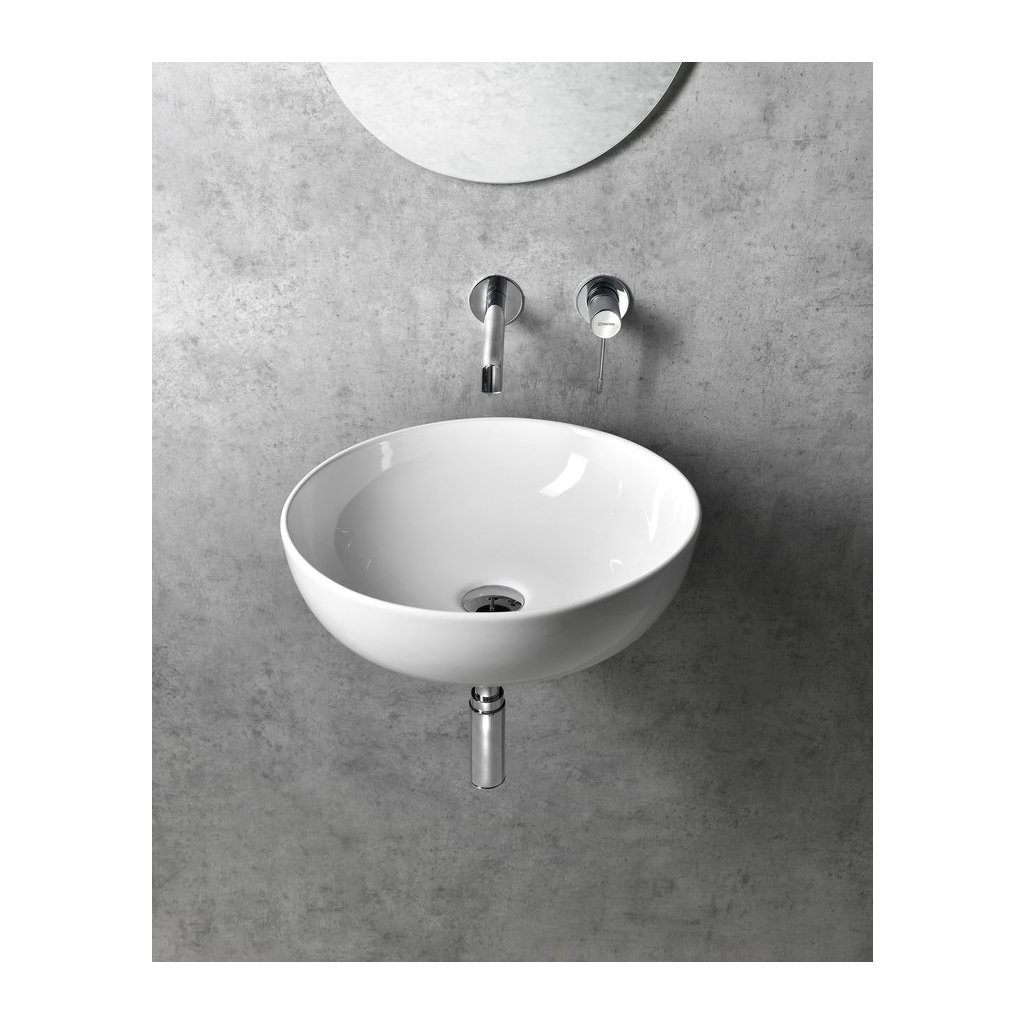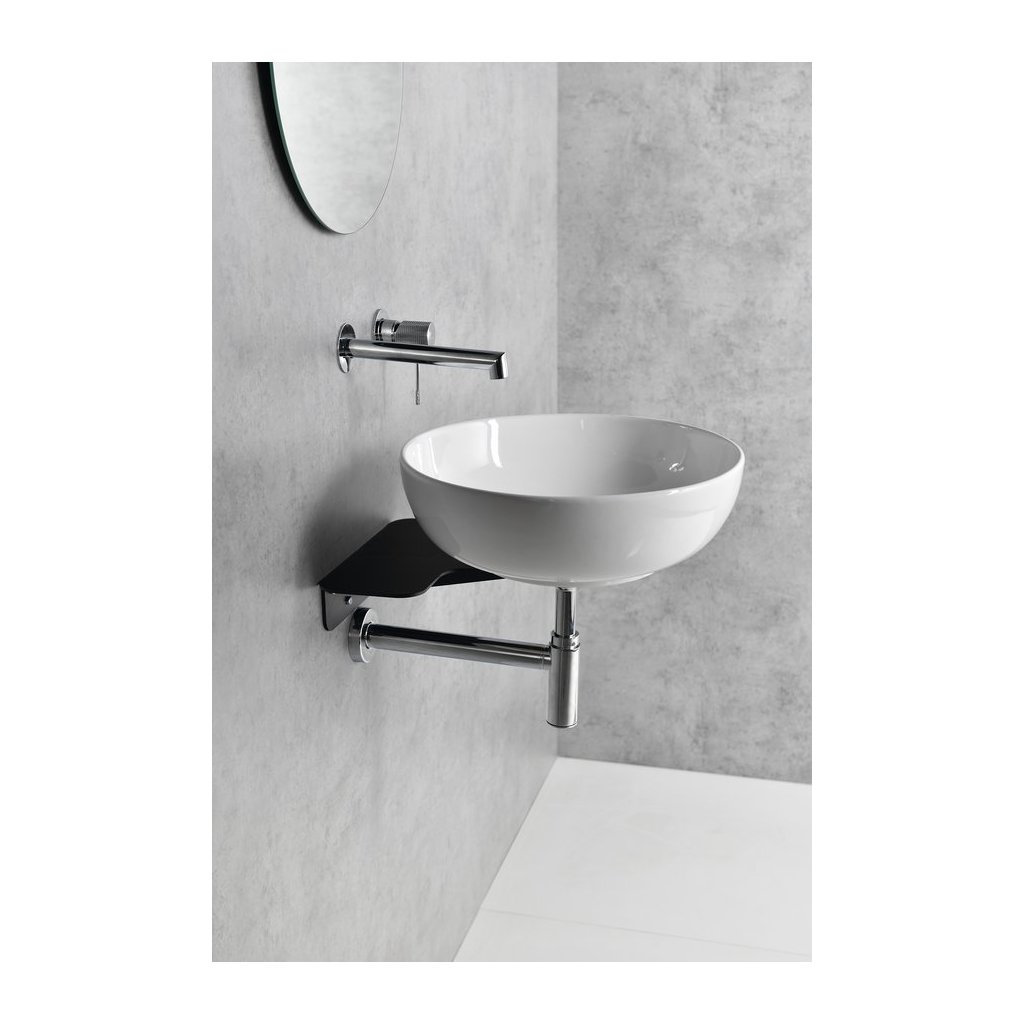 Un set elegant format dintr-o chiuvetă rotundă din ceramică cu diametrul de 41 cm și un suport/consolă robustă din oțel, de culoare negru mat. Designul este destinat instalării pe perete cu baterie ascunsă sau montată pe perete, în timp ce chiuveta nu are orificiu pentru baterie și nici orificiu de preaplin. Scurgerea (Click-Clack) este inclusă.