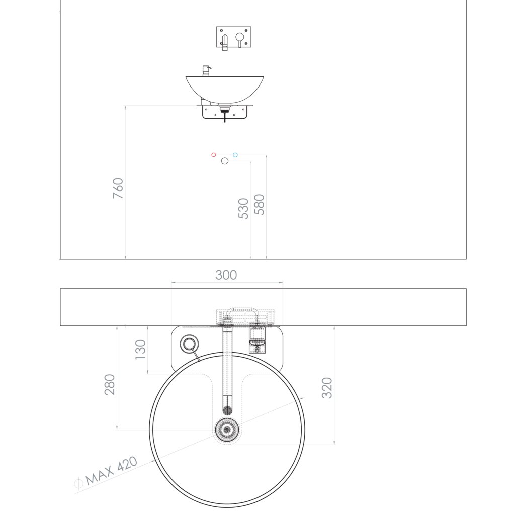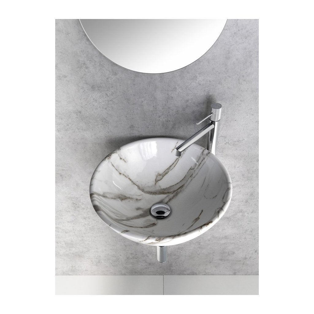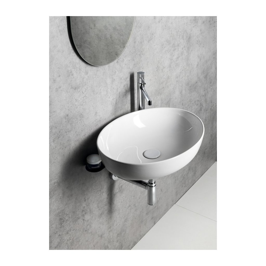 Un set elegant format dintr-o chiuvetă rotundă din ceramică cu diametrul de 41 cm și un suport/consolă robustă din oțel, de culoare negru mat. Designul este destinat instalării pe perete cu baterie ascunsă sau montată pe perete, în timp ce chiuveta nu are orificiu pentru baterie și nici orificiu de preaplin. Scurgerea (Click-Clack) este inclusă.