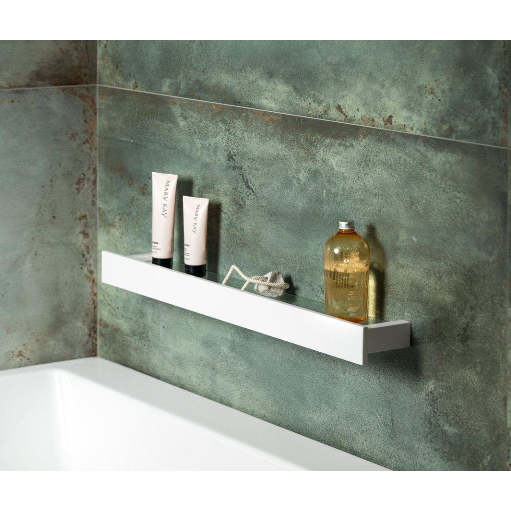 Raft de baie din sticlă cu șină inferioară din seria PATRON. Fabricat în alb modern. Instalarea este destinată montării pe perete prin găurire. Lățimea de 78 cm oferă un spațiu de depozitare mai spațios.