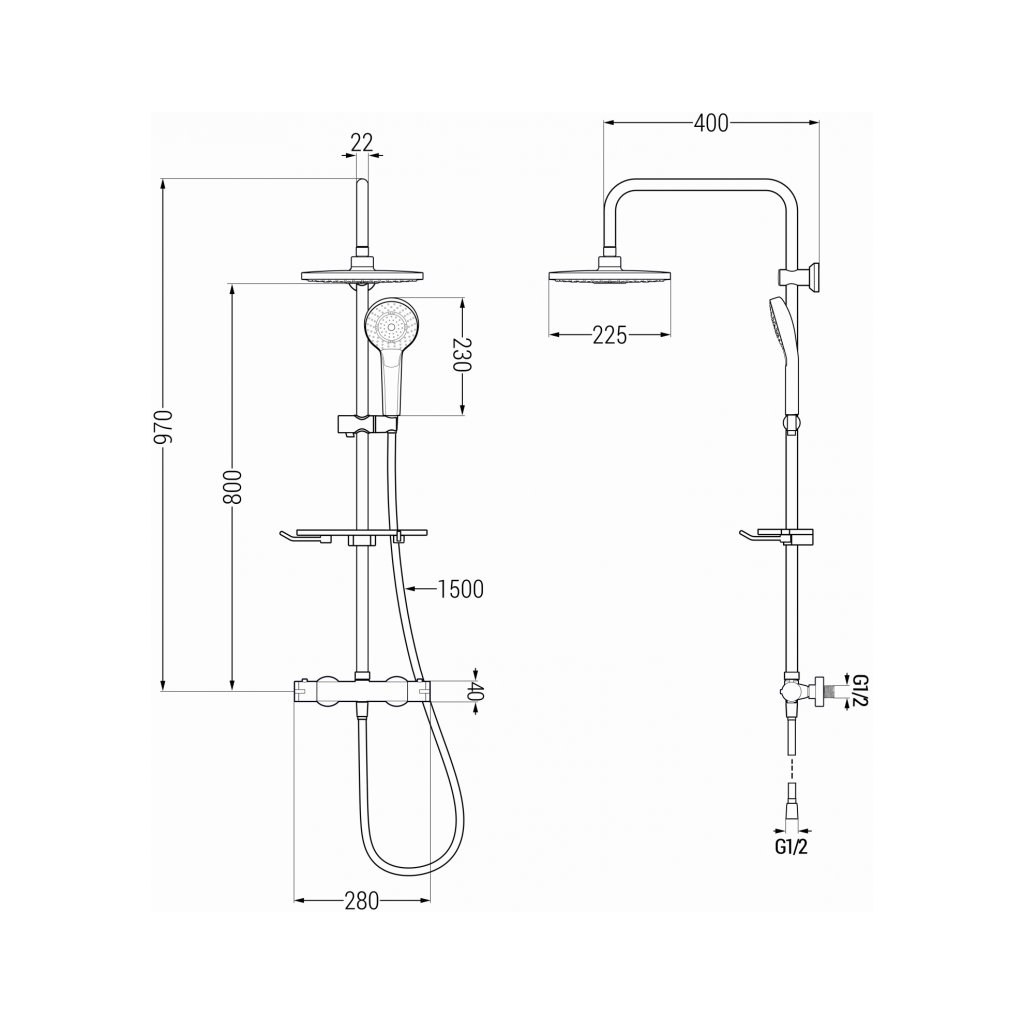- Conexiuni: 1/2" (jos - duș de mână) + 3/4" (sus pentru coloana de duș)