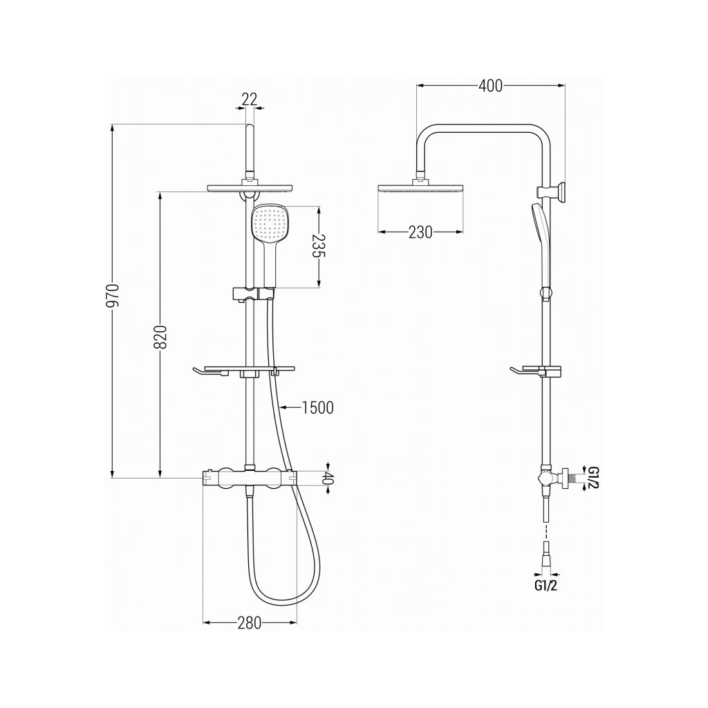 - Conexiuni: 1/2" (jos - duș de mână) + 3/4" (sus pentru coloana de duș)