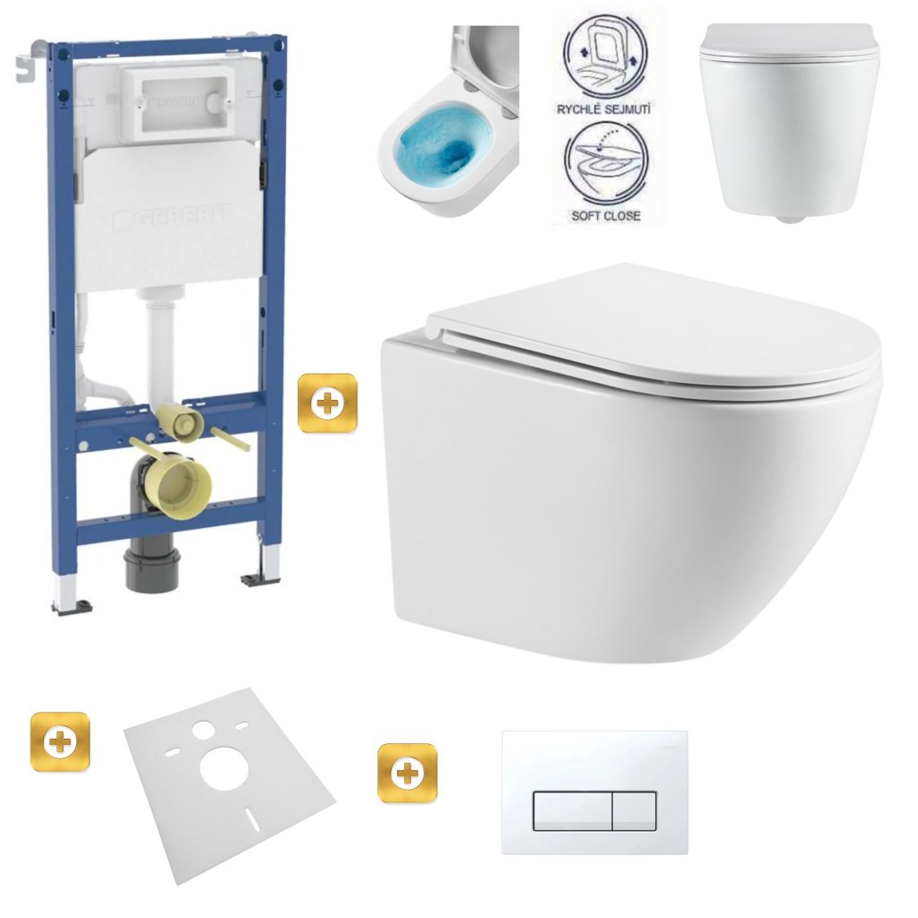 Set suspendat GEBERIT Duofix Basic+ WC LENA RIMLESS 48 x 36 cm + placă cu cădere lentă Slim + buton alb + covoraș izolator