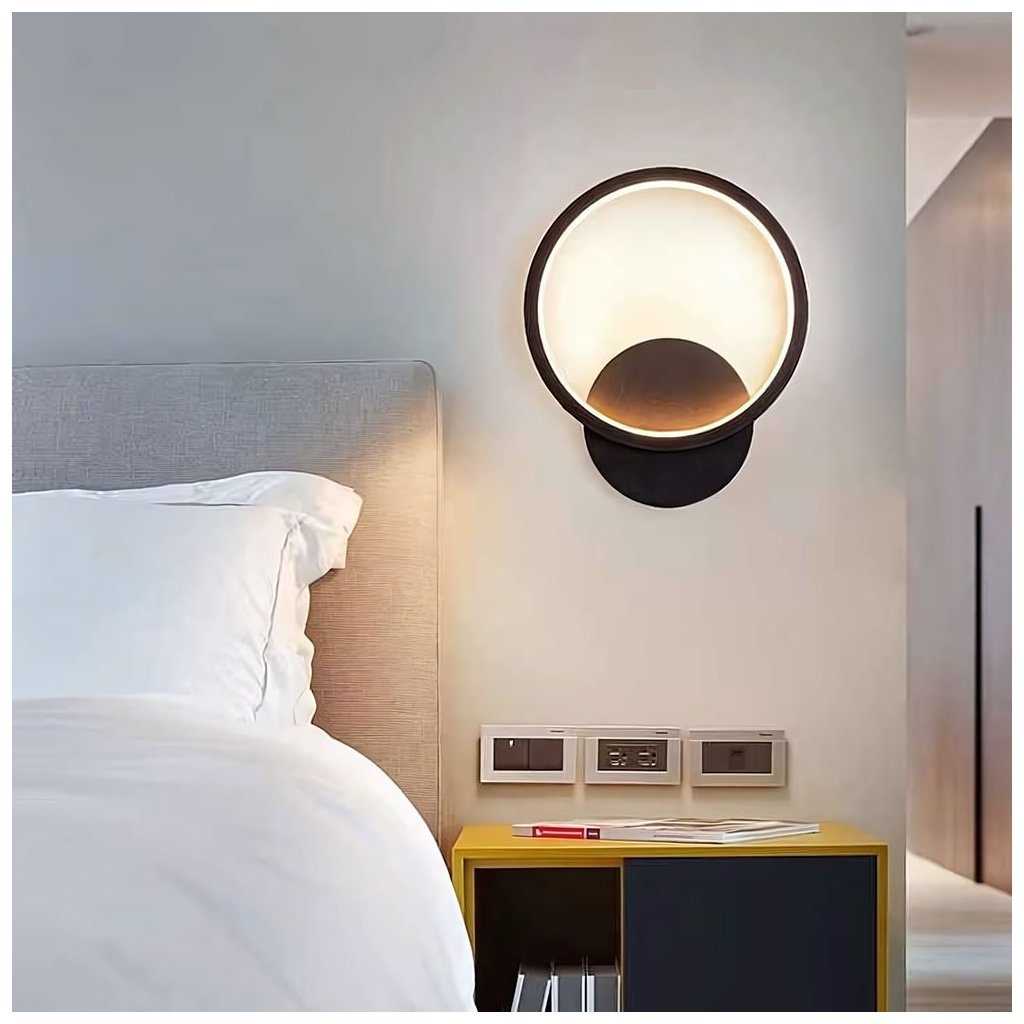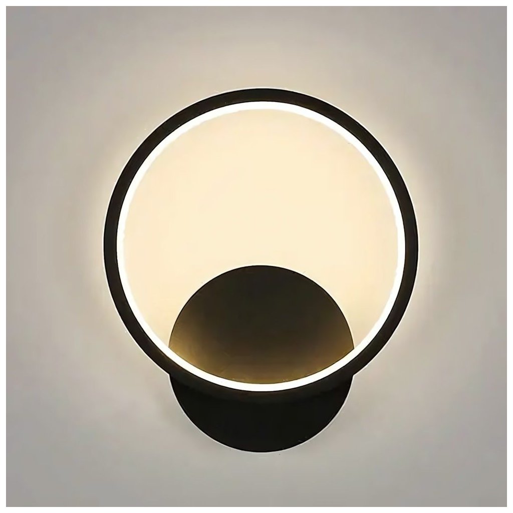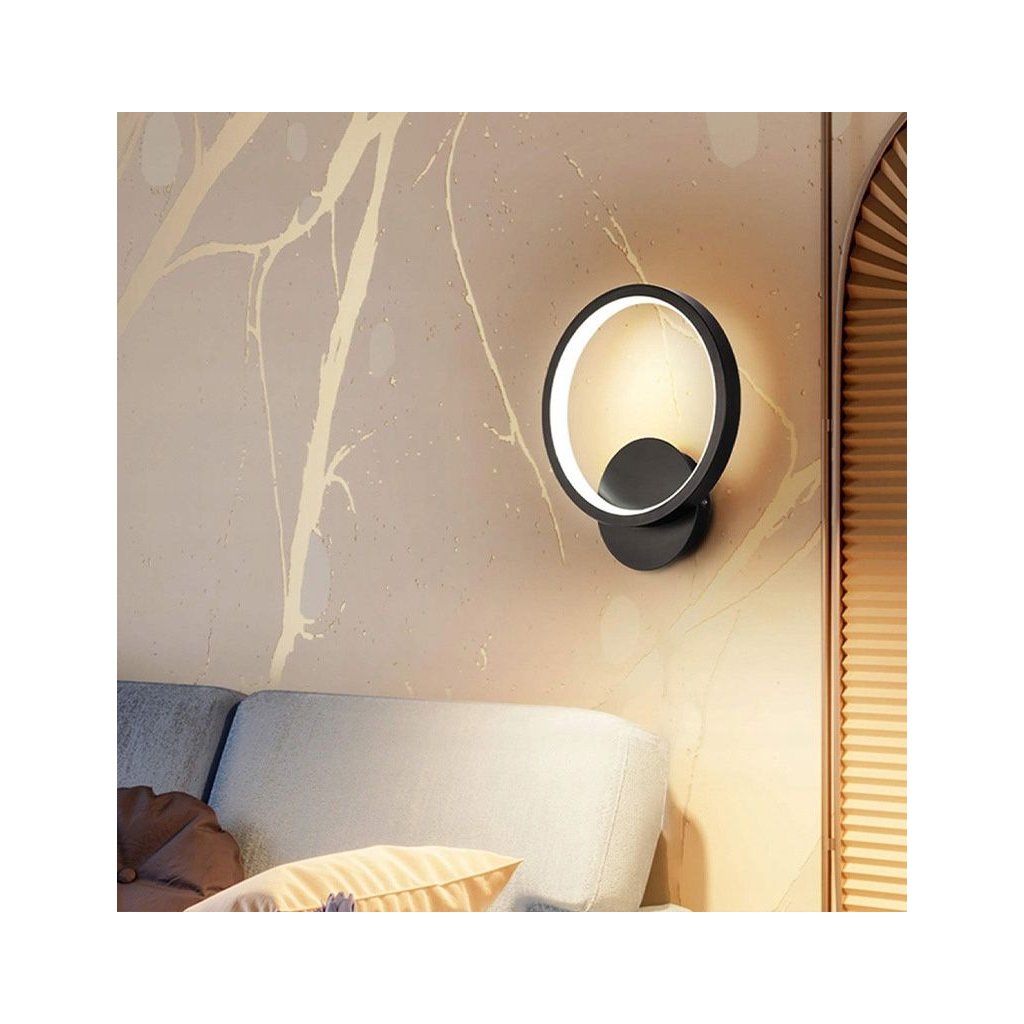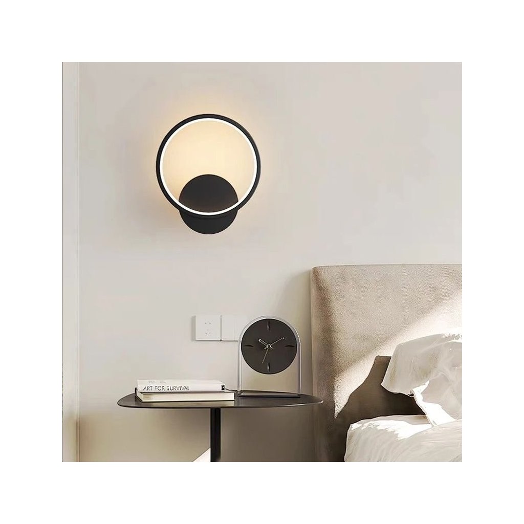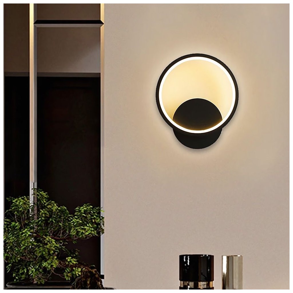 Aplica LED modernă cu finisaj negru mat combină estetica minimalistă cu o formă de design. Designul rotund, cu sursă de lumină încorporată, emite o strălucire caldă plăcută (3000K), creând un efect de halou pe perete. Modulul LED integrat în interiorul ramei difuzează uniform lumina, evidențiind conturul lămpii și oferind interiorului o atmosferă unică. Modelul este ideal pentru dormitor, living, hol sau ca iluminat de accent în spații comerciale.