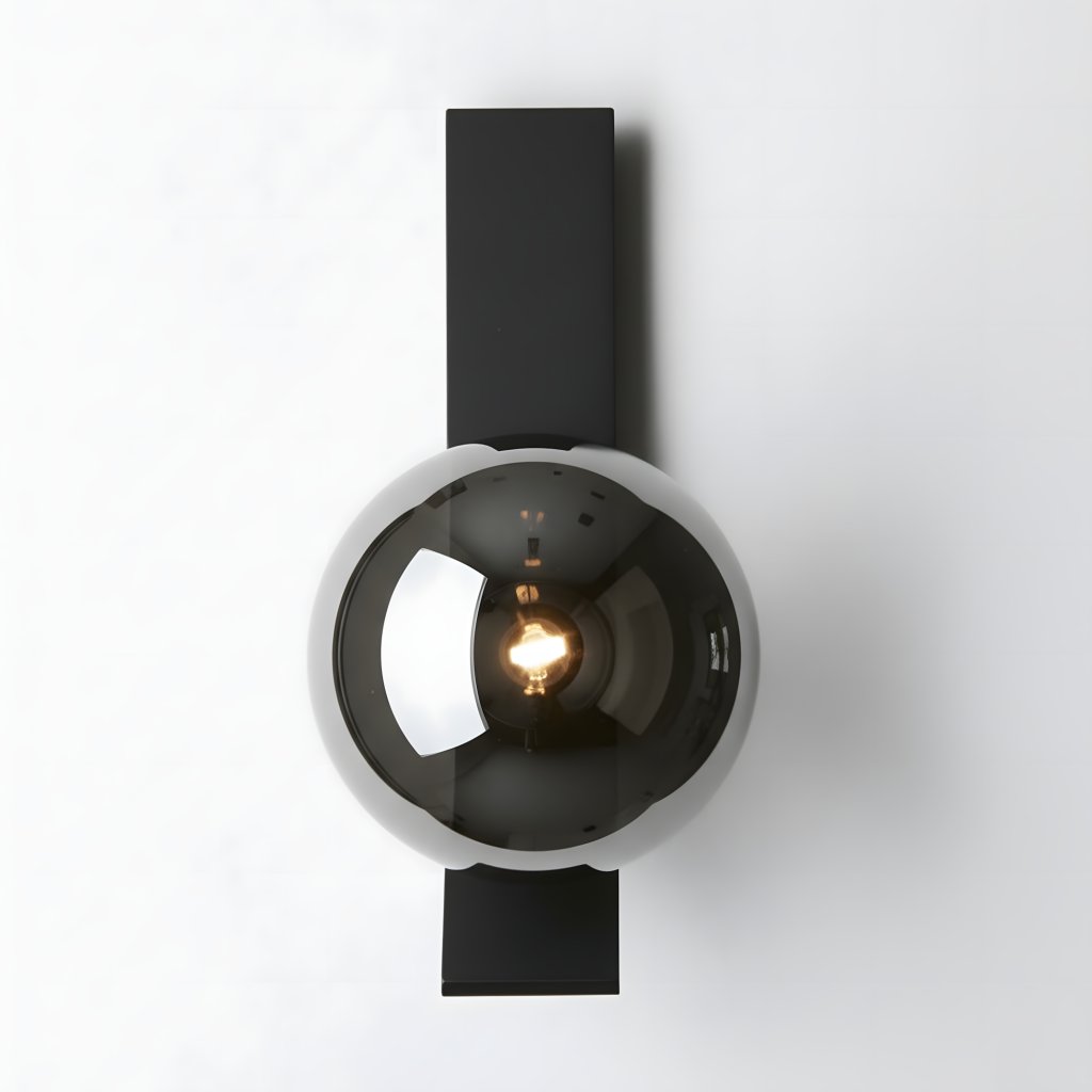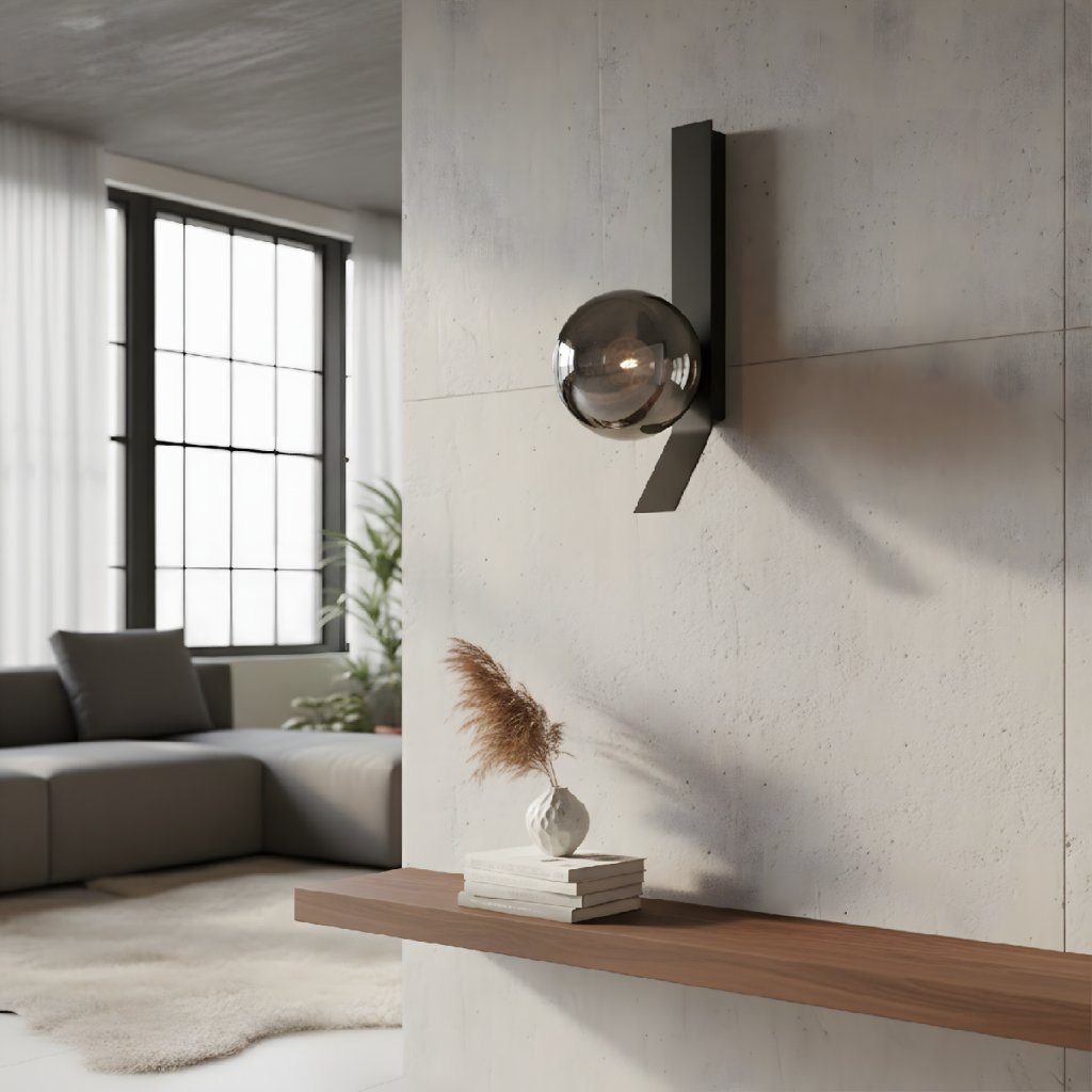 Aplica combină linii negre minimaliste cu o sferă strălucitoare într-o nuanță de crom fumuriu. Forma geometrică organizează peretele, iar abajurul semitransparent creează o strălucire atmosferică ce adaugă eleganță și profunzime interiorului.