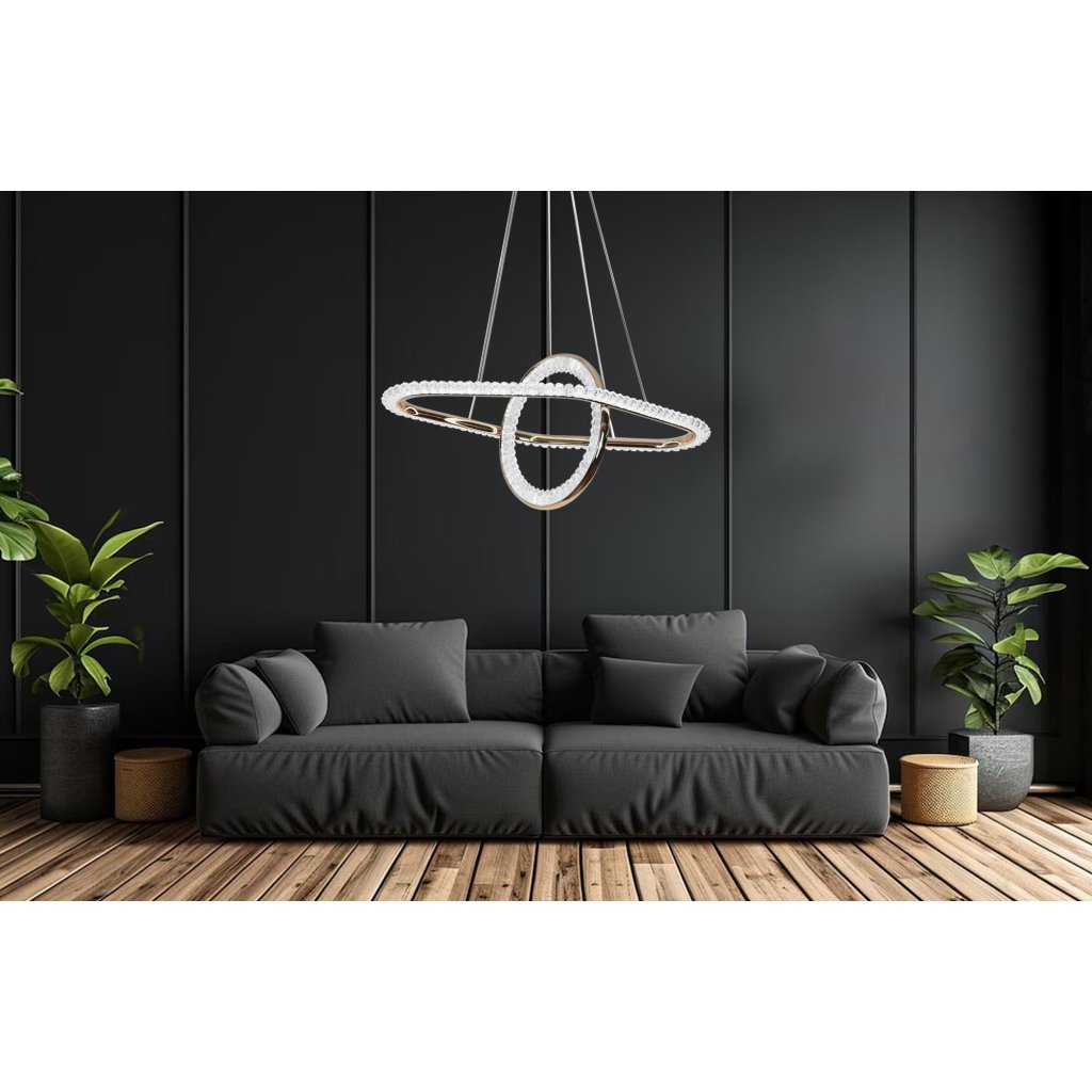 Lampa LED suspendată este o propunere impresionantă, cu un design original care atrage imediat atenția. Forma sa, bazată pe trei inele care se intersectează, creează un sistem spațial dinamic, care amintește de un sistem planetar. Finisajul auriu elegant, combinat cu finisajul cristalin al lămpii, face ca aceasta să fie extrem de luxoasă și va fi o decorațiune unică pentru orice interior modern.