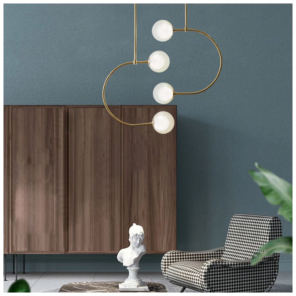 Lampă geometrică suspendată din metal și sticlă. Produsul are 4 nuante.