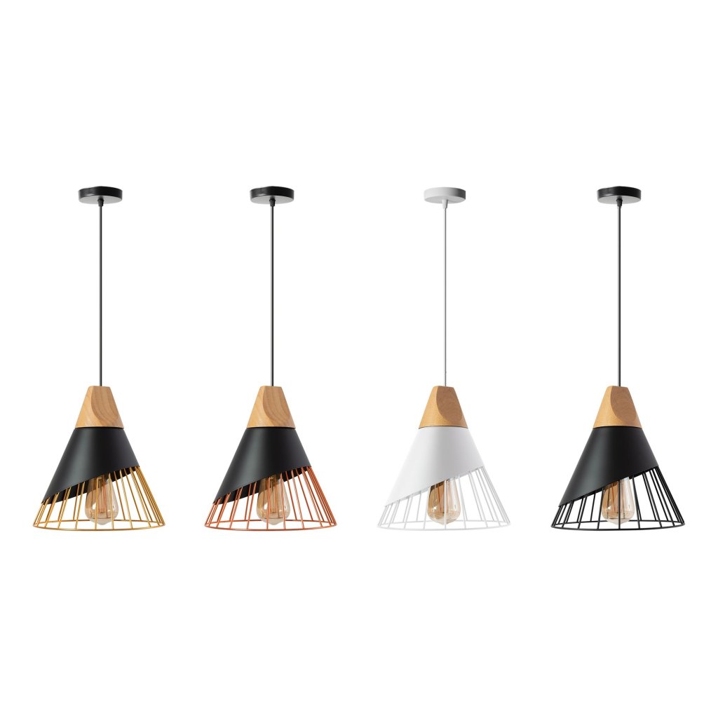 Lampă suspendată în stil scandinav. Combină designul frumos cu funcționalitatea. Combinația de elemente din lemn și aluminiu și forma coșului conferă întregului o formă eclectică. Datorită cadrului cu bare avangardiste și o nuanță asimetrică, întregul arată ca cel mai bun plus pentru un stil scandinav sau minimalist. Fabricat din aluminiu in combinatie cu lemn. Cablul reglabil vă permite să vă adaptați la orice interior. Produsul este disponibil în patru variante de culoare: alb, negru, negru și auriu și negru combinat cu aur roz.