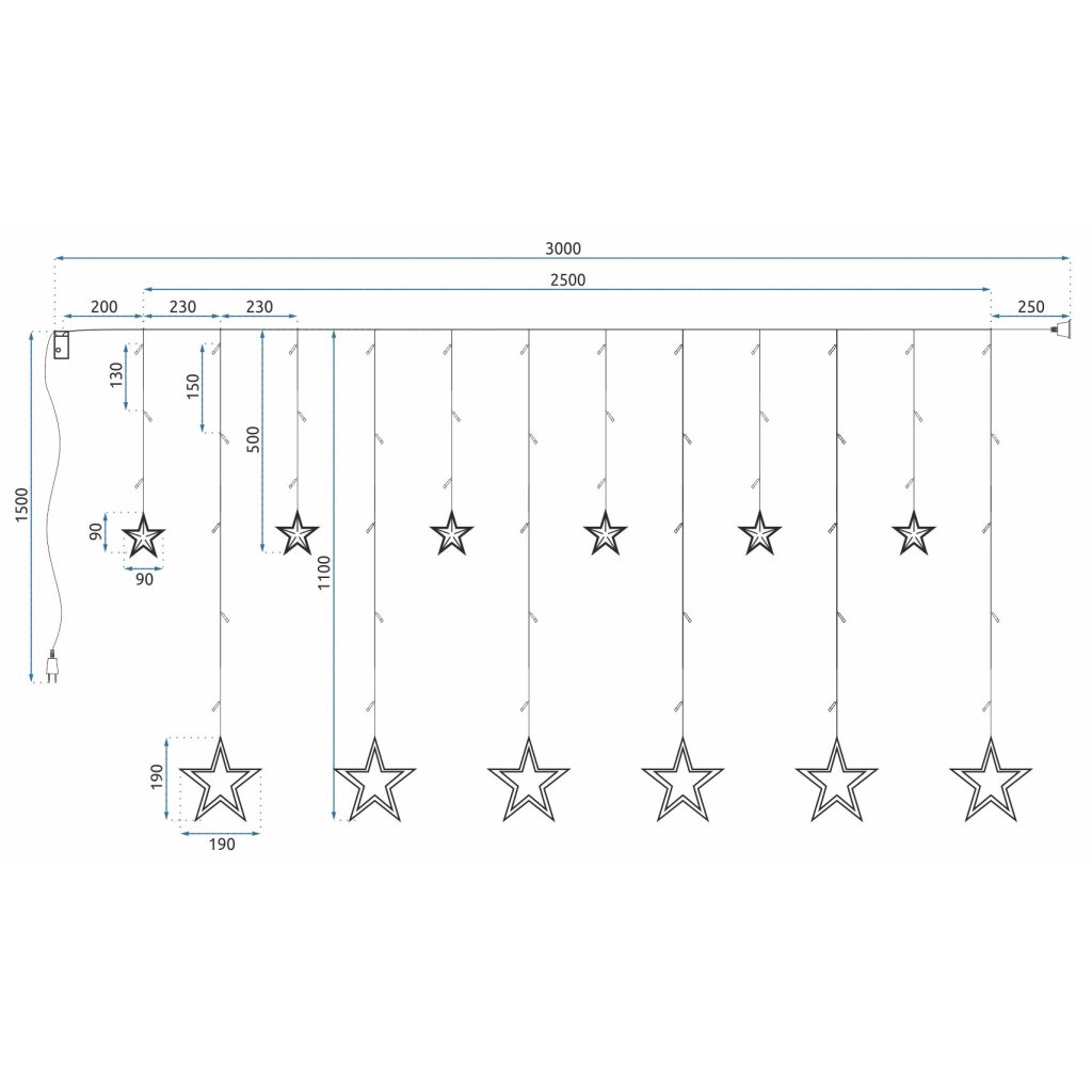 Setul este format din 4 stele LED suspendate de 18,5 × 18,5 cm și 4 stele de 9 × 9 cm. Lungimea ghirlandei este de 300 cm.