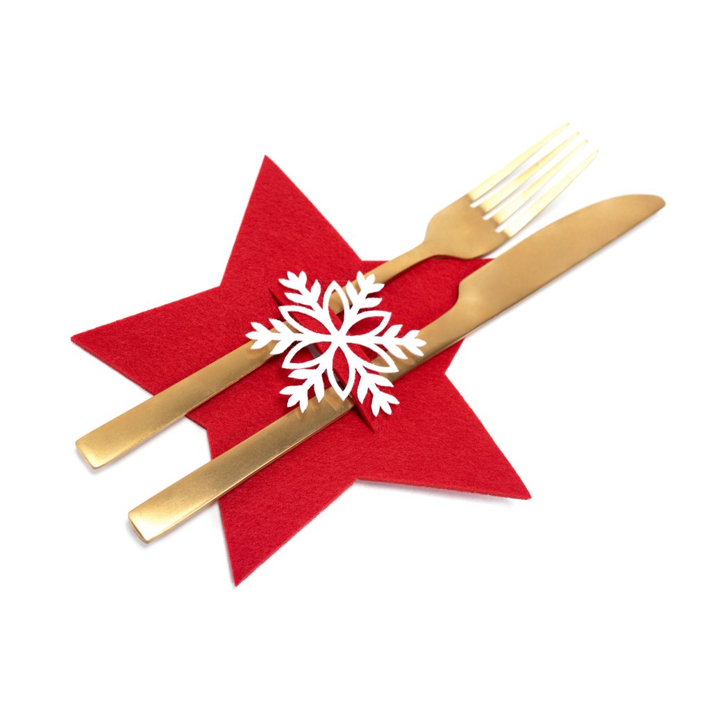 Huse frumoase de tacâmuri roșii cu motiv de stele. Acestea vor fi un final unic pentru masa de Crăciun Ambalajul decorativ a fost atent conceput și realizat pentru a mulțumi ochiul în cea mai frumoasă perioadă a anului.