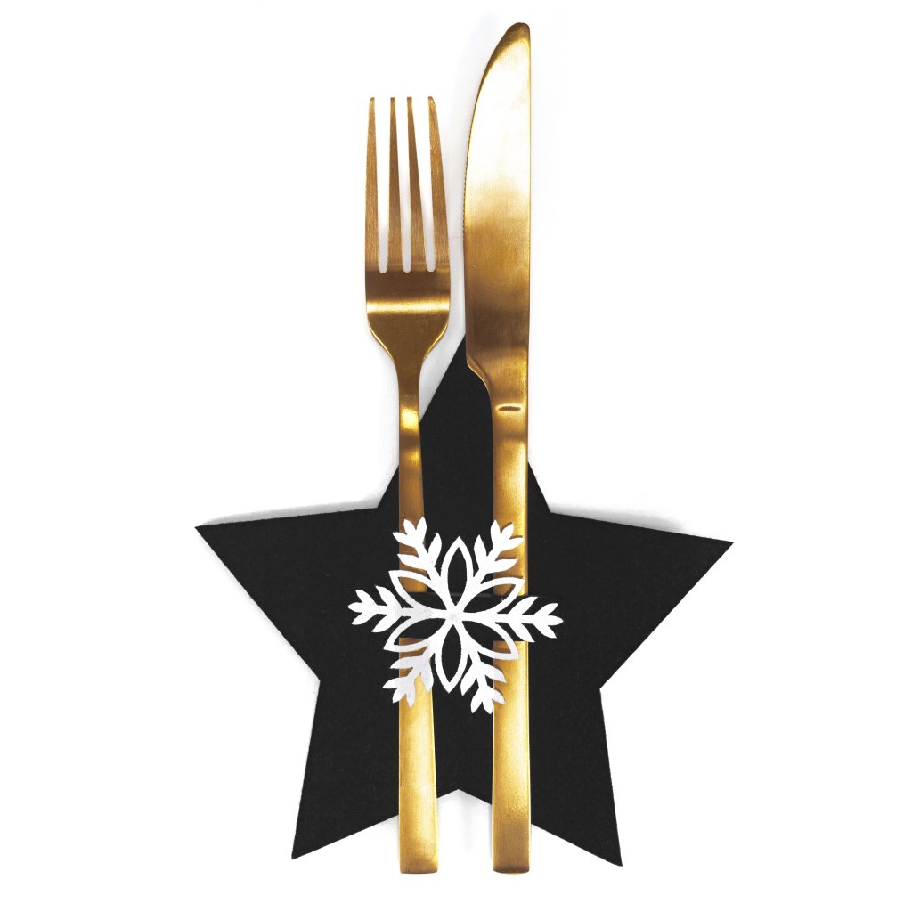 Huse frumoase pentru tacâmuri negre, cu motiv de stea. Acestea vor fi un final unic pentru masa de Crăciun Ambalajul decorativ a fost atent conceput și realizat pentru a mulțumi ochiul în cea mai frumoasă perioadă a anului.